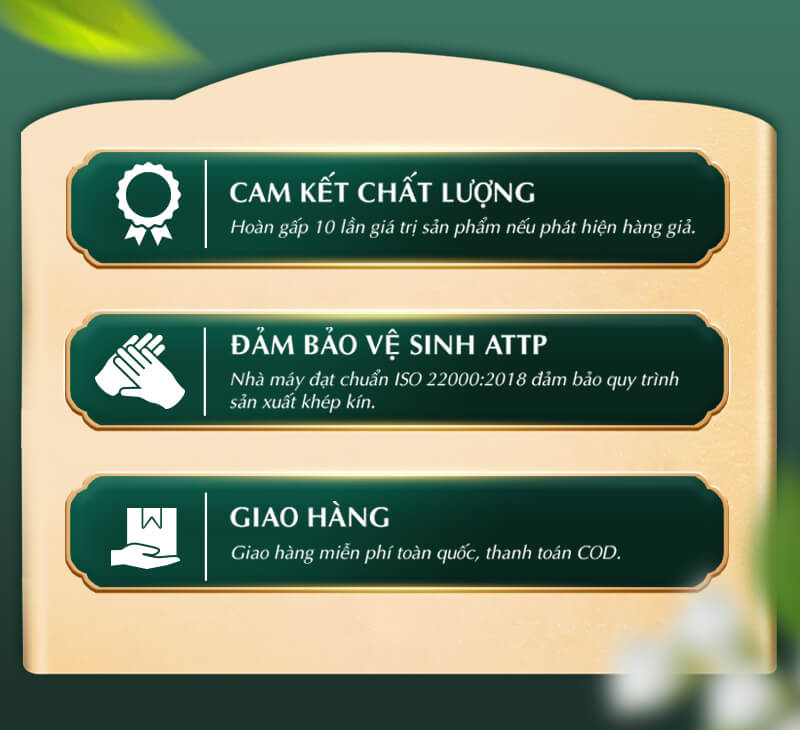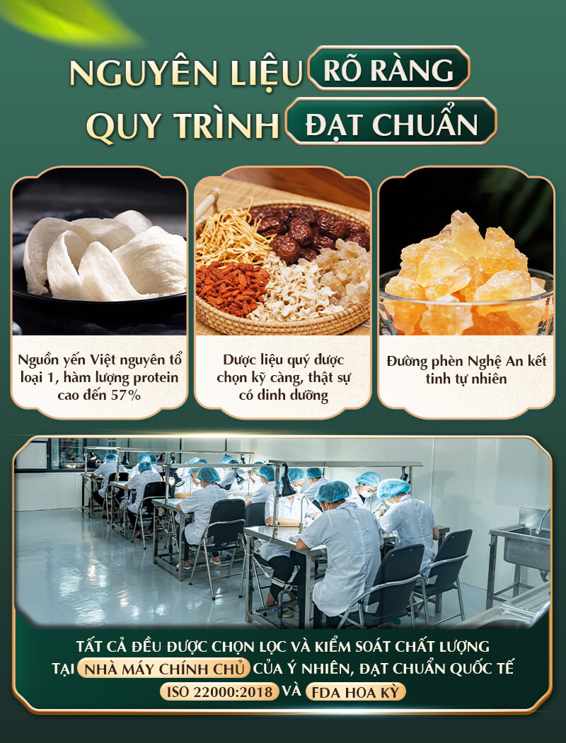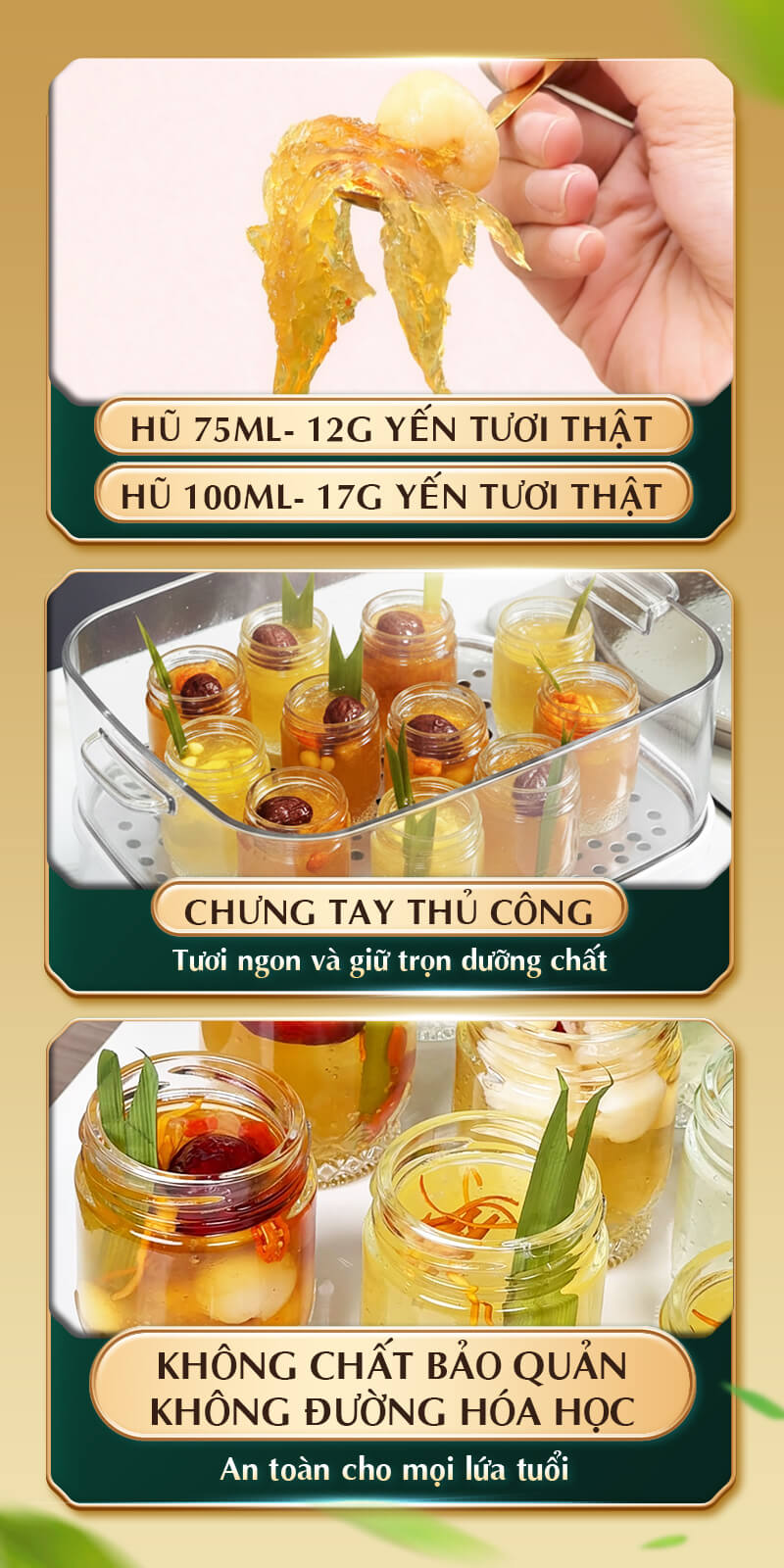- Cam kết không chất tẩy trắng, không chứa yến nhân tạo, yến pha trộn